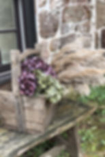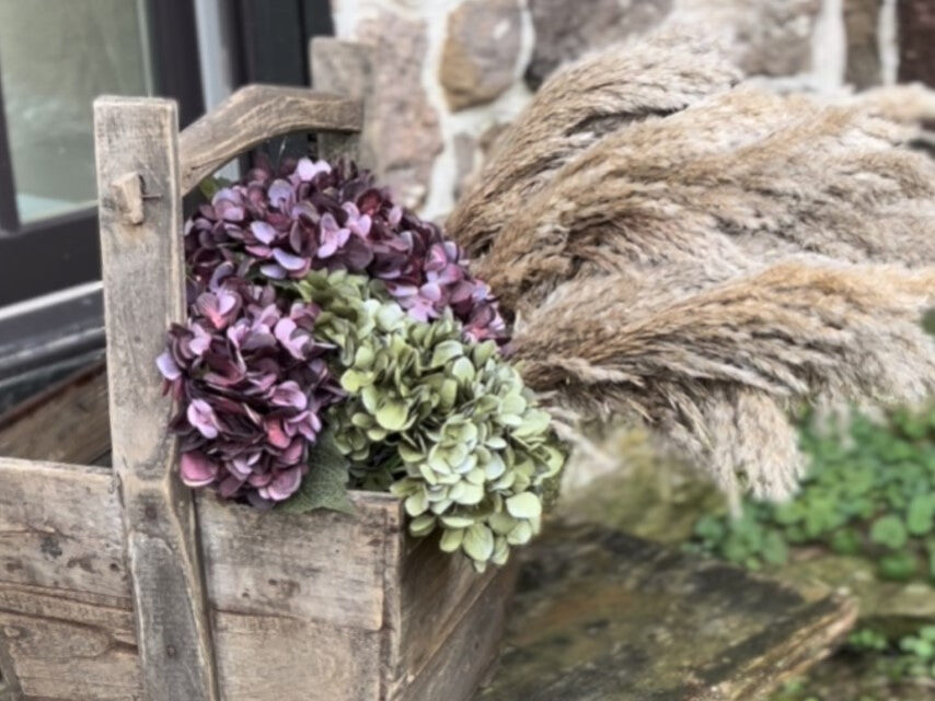 Something old, something old…our farmhouse was built in the 1790’s. The one side still has the original doorway. We have an old bench that sits there that we change up the decor monthly. This month we put away the dairy bucket and field flowers and added our Found Grain Box and newly arrived Reed Grass Stems and Hydrangeas. I feel like the old box would be something that would have been found there when the farmhouse was new. Making it seem like it’s at home.