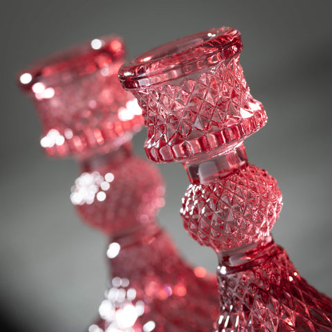 This stunning set of two pink glass candlestick holders is the perfect marriage of seasonal farmhouse decor and high class. The textured glass catches the light at all times- the sunlight during the day or the flickering warm candlelight over dinner.