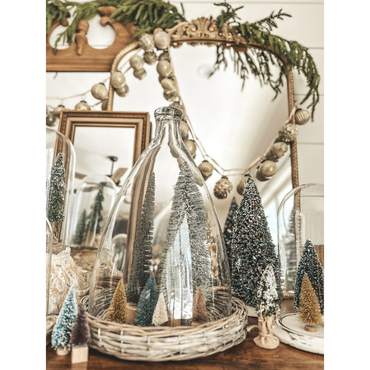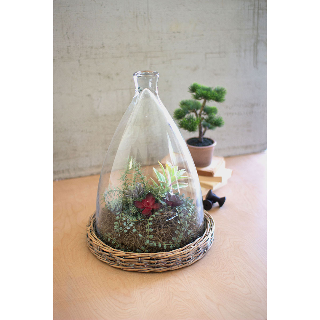 This is by far the largest in our collection of cloches. The 17″ Large Bell-Shaped Cloche with Willow Base is perfect to display your special treasures. The cloche lifts off easily so you can fill the base with whatever your heart desires. Because of its size it would make a beautiful centerpiece.