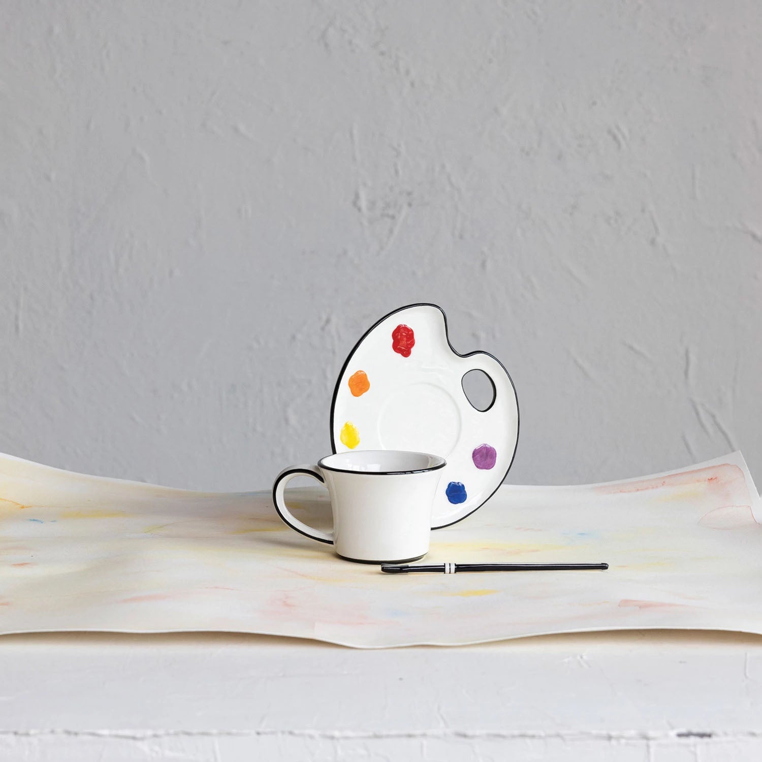 3 Piece Stoneware Paint Palette Cup and Saucer with Paint Brush Stirrer