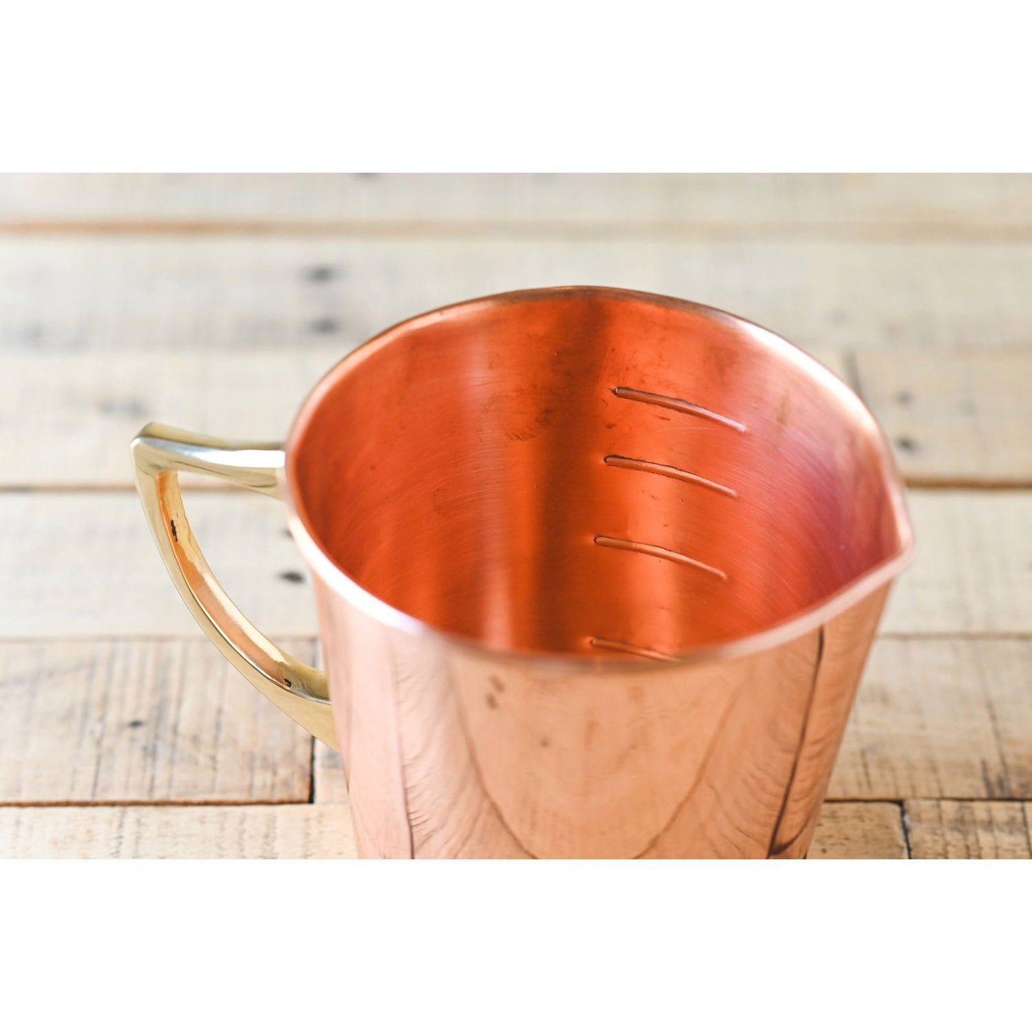 Copper liquid measuring cup with interior and exterior markings; Brass handle; 4 Cup Capacity.