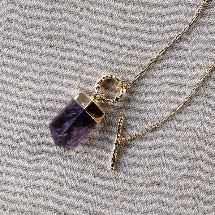 The toggle clasp of the Bobble Necklace is designed as an ornamental front connection that enhances the presentation of the pointed amethyst stone that dangles from it. Set on a 19-inch chain, the violet-hued amethyst is a stone believed to reduce stress and anxiety. Choose from a gold-plated or silver chain.