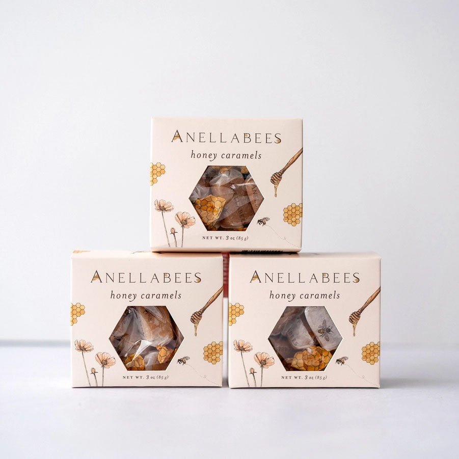Anellabees honey caramels combine the perfect amount of honey, organic sugar, grass-fed butter, and heavy cream for a classic caramel taste, only better! Each small batch is made without preservatives, free of corn syrup and soy lecithin, and individually wrapped in wax paper. Perfect for gifting.