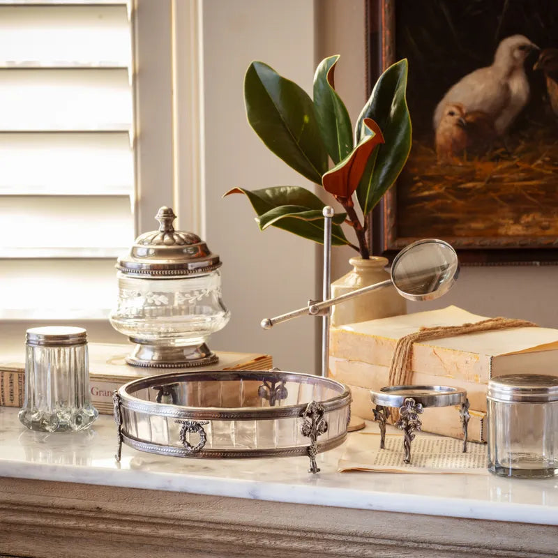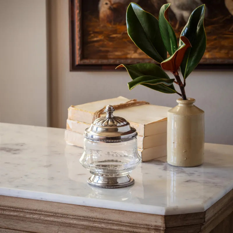 Introducing our Antique Silver Collection – Etched Glass Vanity Jar. A perfect addition to your vanity or office space, this jar features a unique design that exudes elegance. Crafted with care, it adds a touch of sophistication to any room. Stow your essentials in style with this exquisite piece.