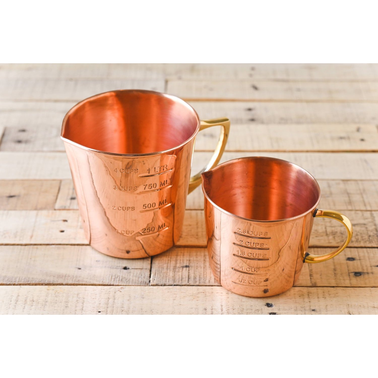 Copper liquid measuring cup with interior and exterior markings; Brass handle; 2.5 Cup Capacity.