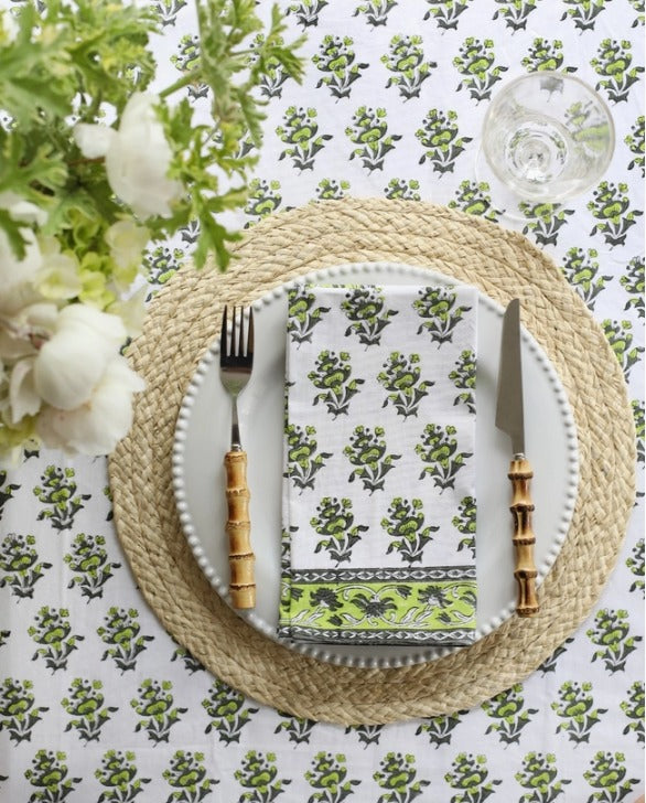 Elevate your dining experience with our Buti Hand Block Tablecloth. Featuring is block-printed in beautiful shades of green, this tablecloth adds a touch of elegance to any meal. Choose from variety of sizes to perfectly fit your table.