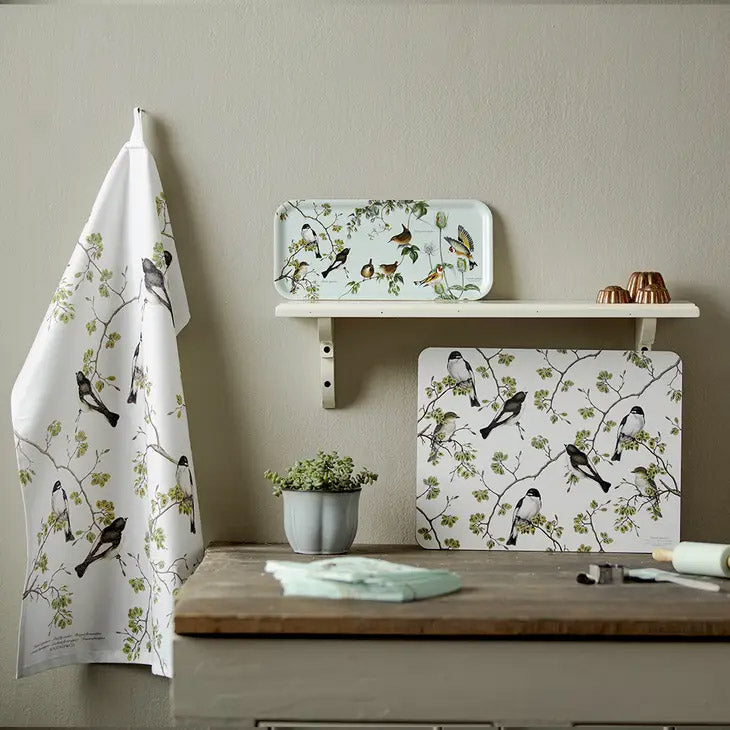 Adorable tea towel with beautiful neutral-colored birds manufactured in Europe from 100% organic cotton. The tea towel is equipped on the back with a small strap for hanging.