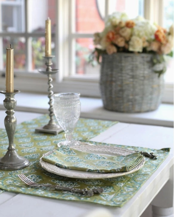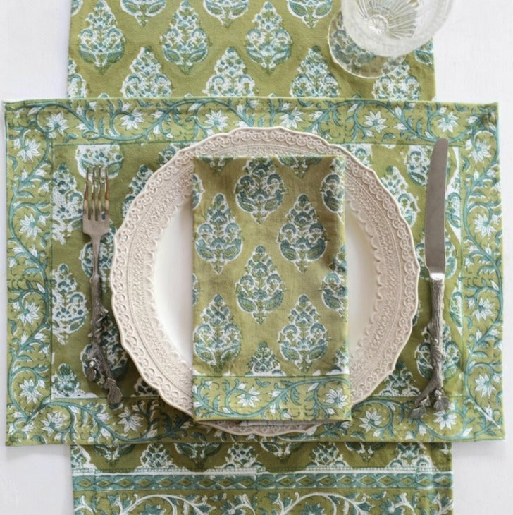 Elevate your dining experience with our Set of 4 Olive Hand Block Napkins. Featuring a rich olive hue and delicate teal accents in a classic buti flower print, these napkins adds a touch of elegance to any place setting. It matches our Olive Hand Block Tablecloth!