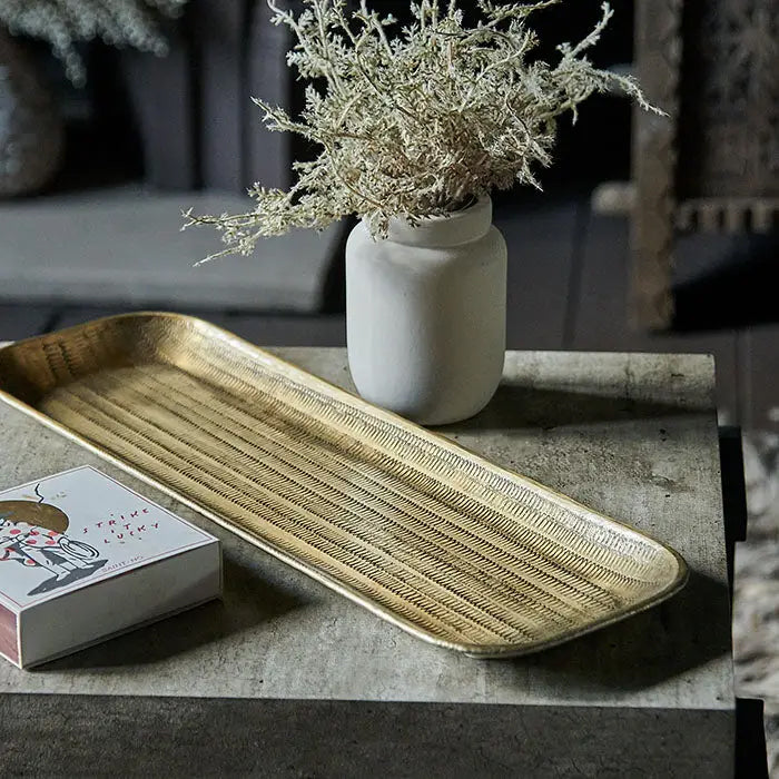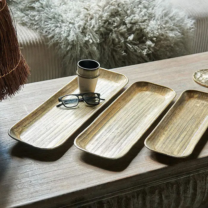 Style up your coffee tables and consoles with the beautiful long Orla tray. In a soft antique gold with texture reminiscent of a basket weave, this decorative tray will catch the eye and add tons of personality in the process. It makes the most stylish place to cluster a few candles or store every day accessories like keys and remotes. Available in three sizes, together they will make the ultimate decorative trio!