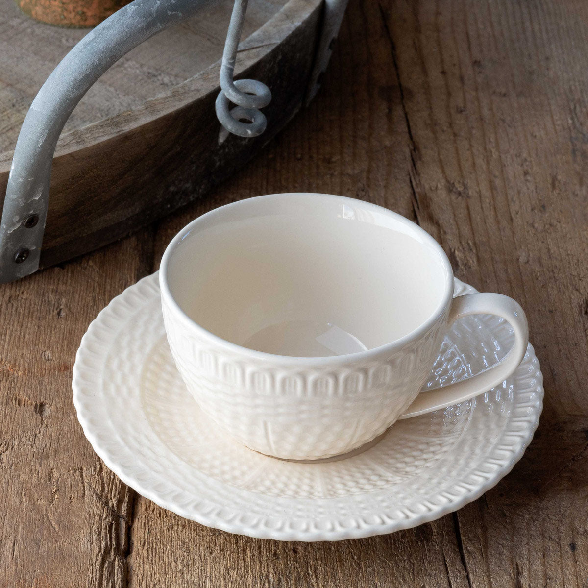 This beautiful Creamware Basketweave Cup & Saucer Set features a unique and elegant embossed pattern and a neutral tone, ideal for creating a sophisticated yet timeless atmosphere. Enjoy a luxurious experience that preserves an air of sophistication and class.