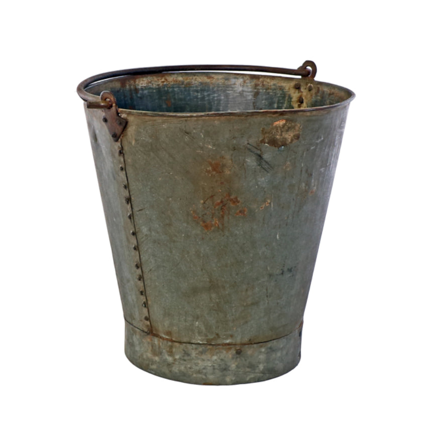 These beautiful vessels were used to catch fresh milk straight from the udders on dairy farms of yesteryear. This vintage zinc bucket is great for firewood storage or garden planters. A weathered patina gives each bucket its unique authenticity. Size may vary.