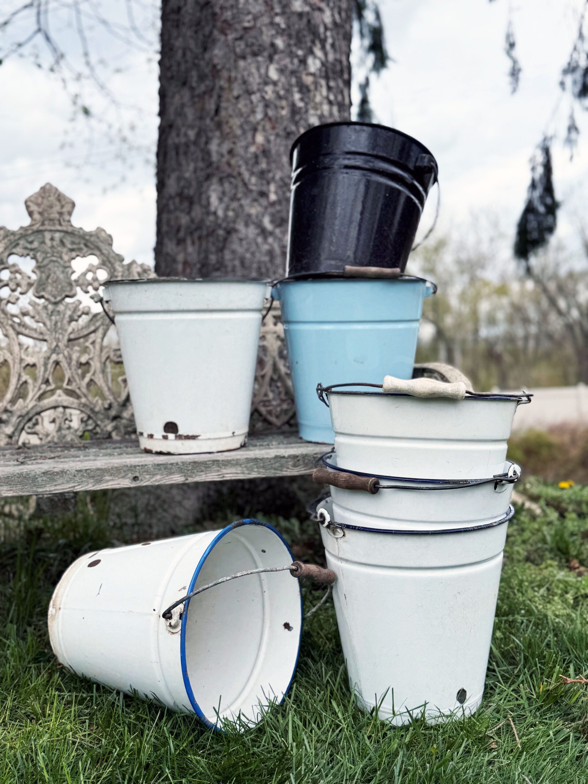Add a touch of vintage charm to your garden with the Found Enamel Bucket. Versatile and beautiful, this bucket found in Europe can also be filled with florals for a stunning centerpiece. A must-have for any garden or home decor enthusiast!