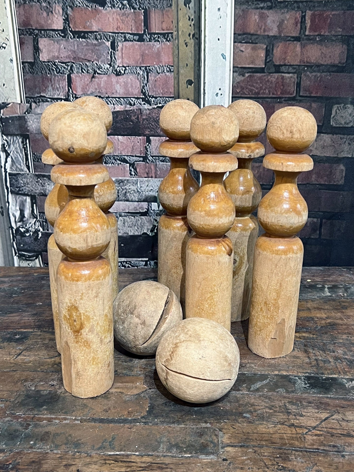 Add a touch of vintage charm to your game collection with the Found French Wooden Skittle Game. Enjoy the classic fun of bowling with this unique set, featuring 7 pins and two wooden balls. Perfect display piece.