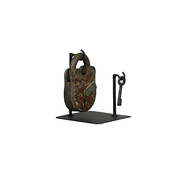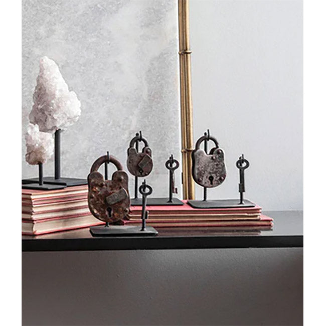 Unlock the lesson: adapting to life’s changes is key! Finding new purpose is at the heart of our Found Lock and Key on Stand accent pieces. The assorted 19th and early 20th century lock-and-key sets are displayed on an industrial base for a creative home accent. What a great display piece! It would look great on a desk or a shelf. Give as a unique gift or keep for yourself.