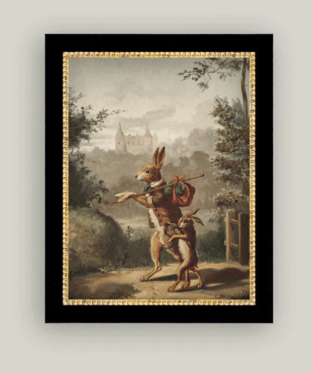 This vintage artwork of a traveling rabbit is the perfect addition to your spring decor collection. The artwork is printed on raw canvas and placed in an antique frame for an authentic, timeless look. Perfect for a child’s room or wall that needs a touch of whimsy