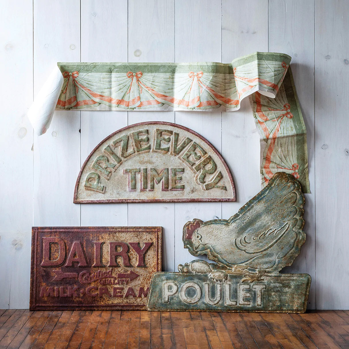 The Large French Chicken Sign is a homage to an era when free-range, organic was just a farm away. The vintage-looking sign reads “Poulet” – the French word for chicken. Made of iron sheet metal and faux weathered. The piece would look amazing hung in a kitchen.