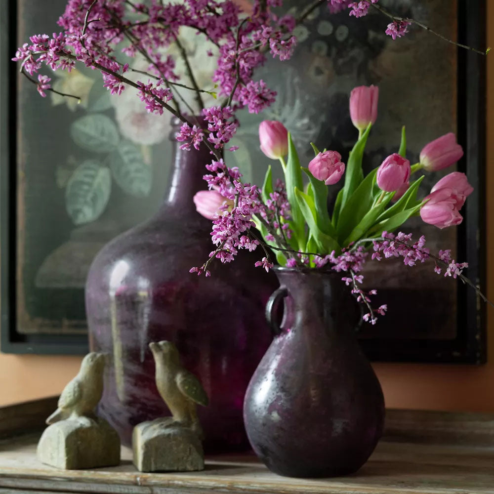 Bring a touch of elegance and charm to your home with our Frosted Plum Bottle Vase! The beautiful plum color adds a pop of color to any room, and its versatile design allows you to display delicate pink flowers in the spring and vibrant, rich flowers in the fall. Its aged look adds a vintage feel, making it the perfect addition to your home decor.