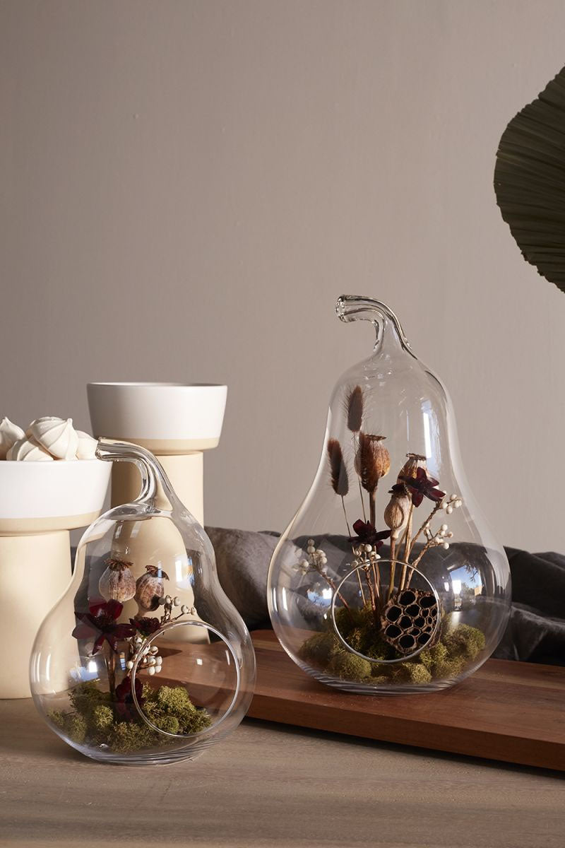 Give your home a touch of elegance with our Glass Pear Terrarium! Crafted with gorgeous glass, this piece adds a beautiful, unique look to your living space while showcasing a small plant or your favorite dry flowers. Choose between our small and large size for the perfect fit. Enjoy an inspiring decor piece today!