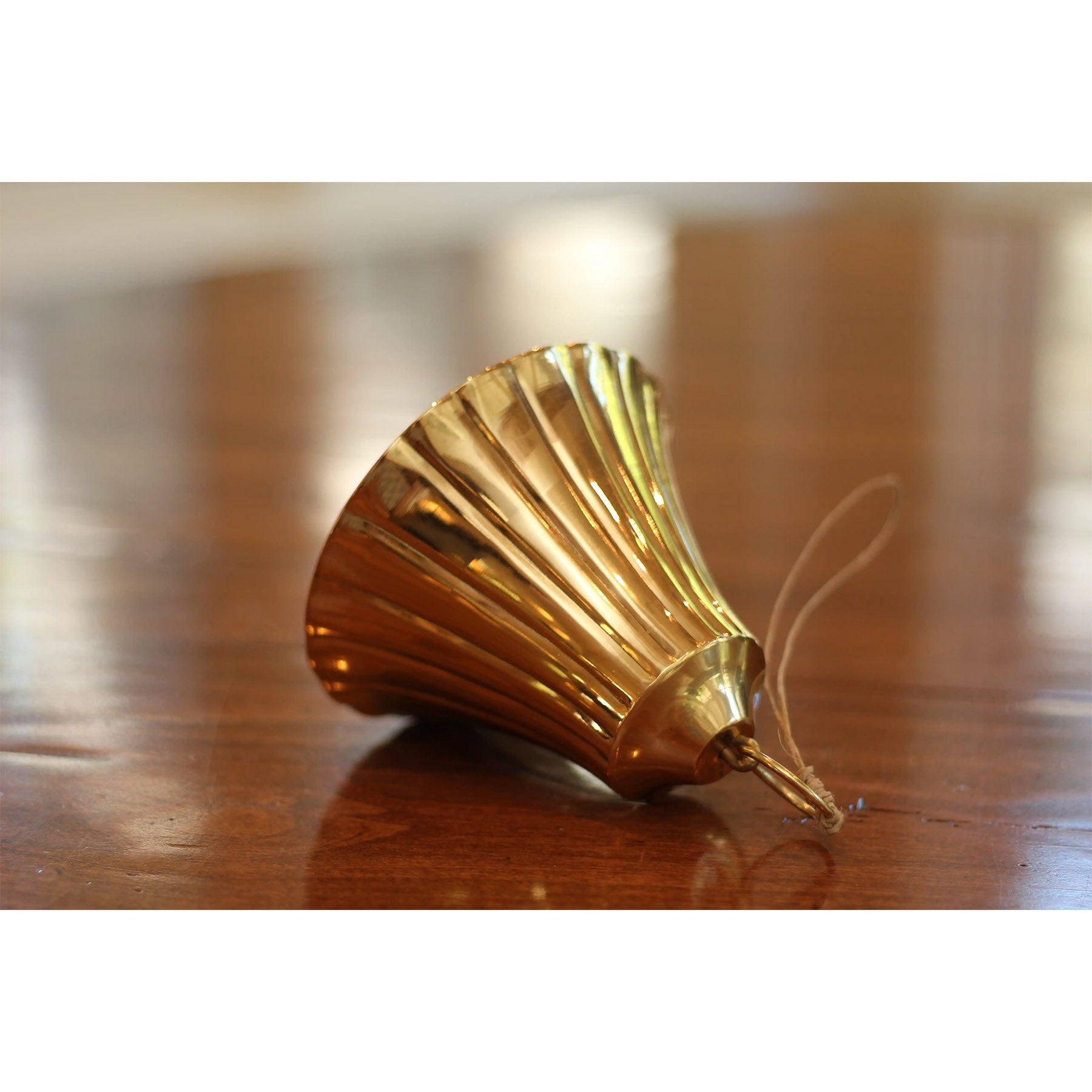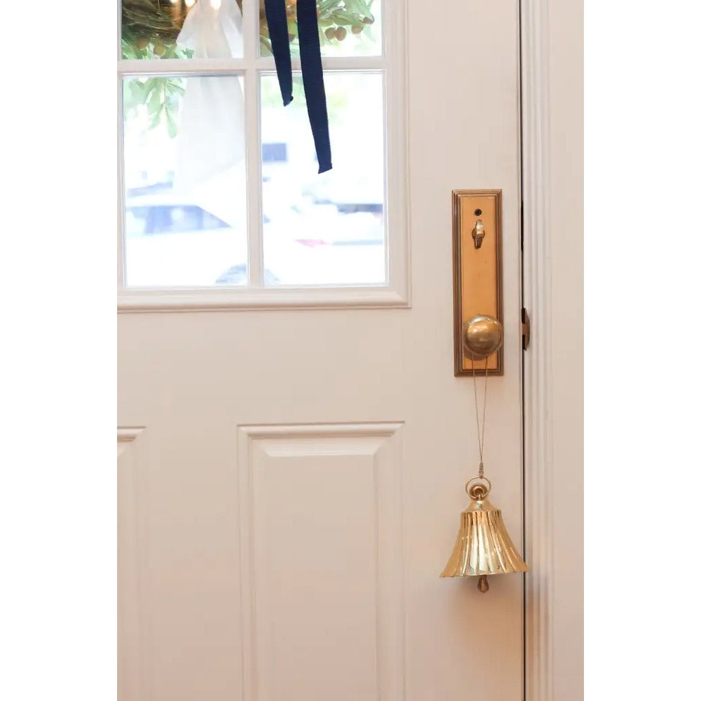 A brass bell made entirely out of brass. The scalloped detail gives a simple bell a sophisticated look. This bell can hang from a wreath, be set as a decorative object on a shelf or coffee table, hang from a banister, drape over a mantlepiece, etc. Our brass bell is 5″ wide and 5″ tall. These bells have a nice weight to it and are anything but chintzy.