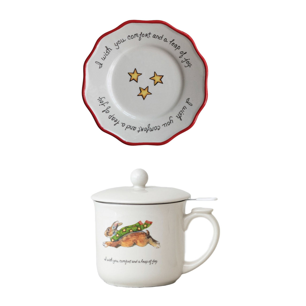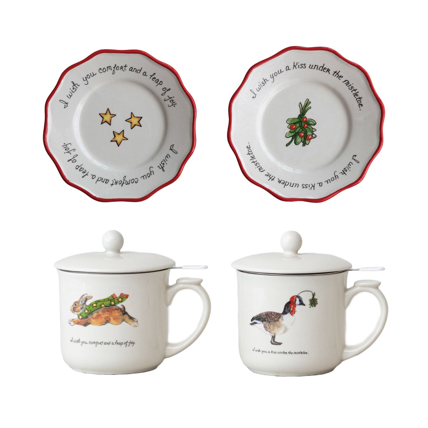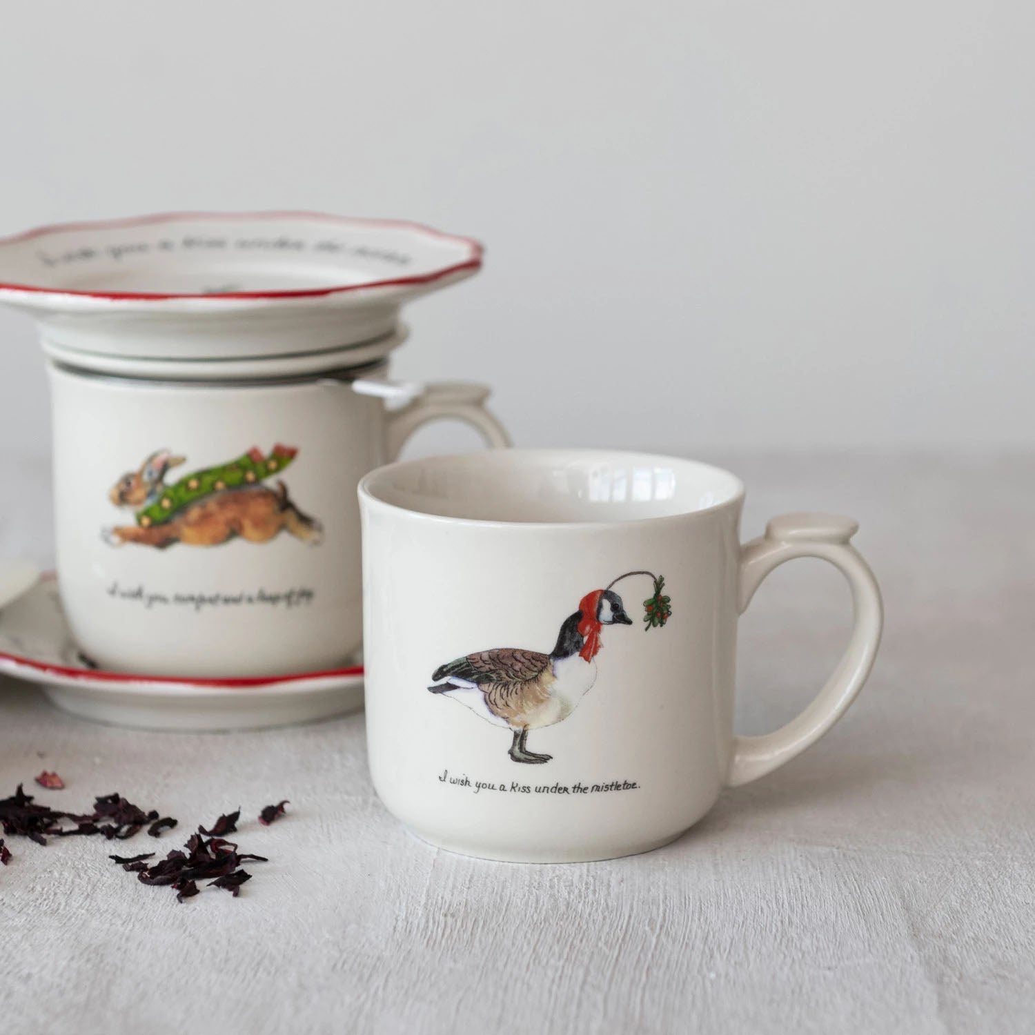 Holiday Stoneware Mug & Saucer w/ Strainer – Choose Style Goose or Rabbit