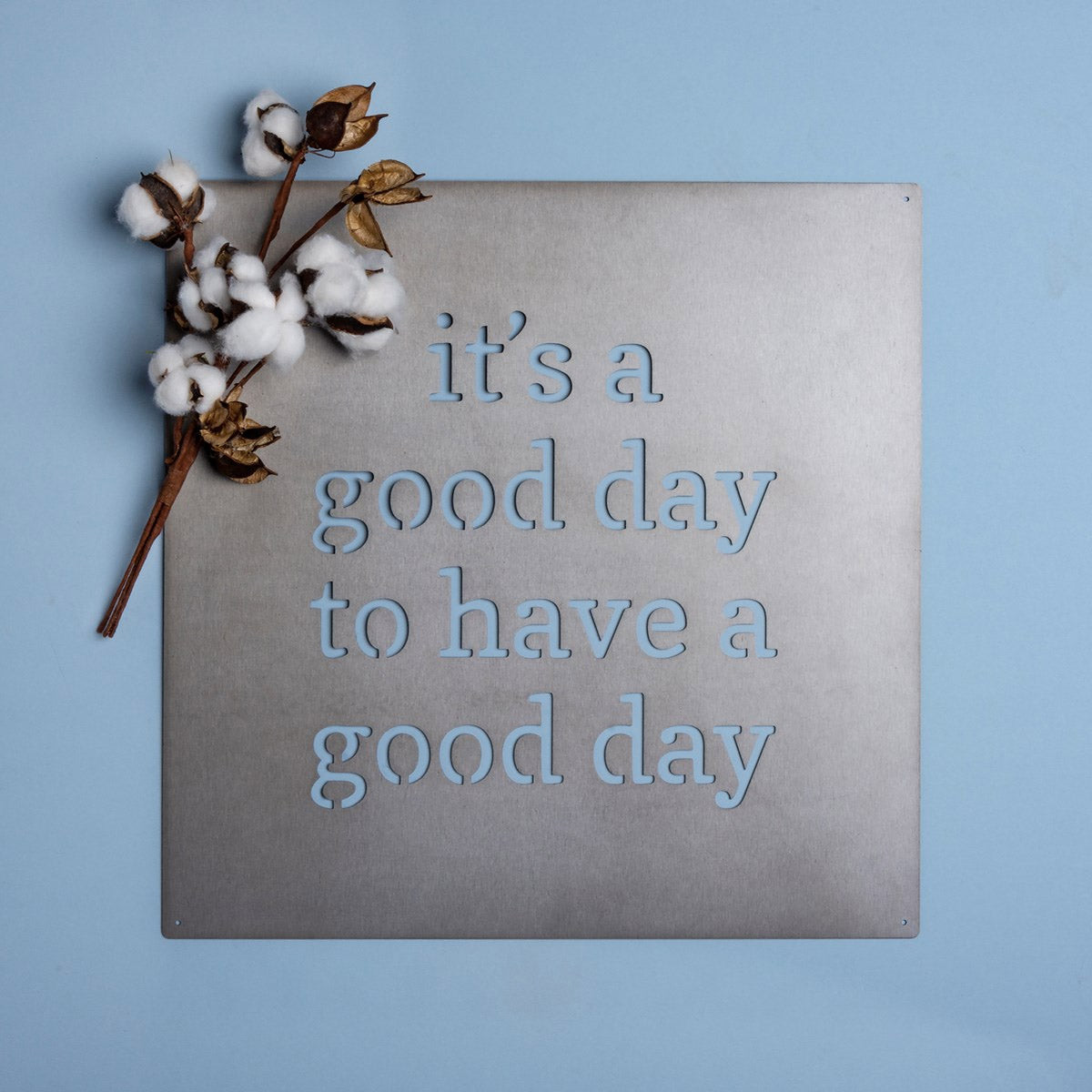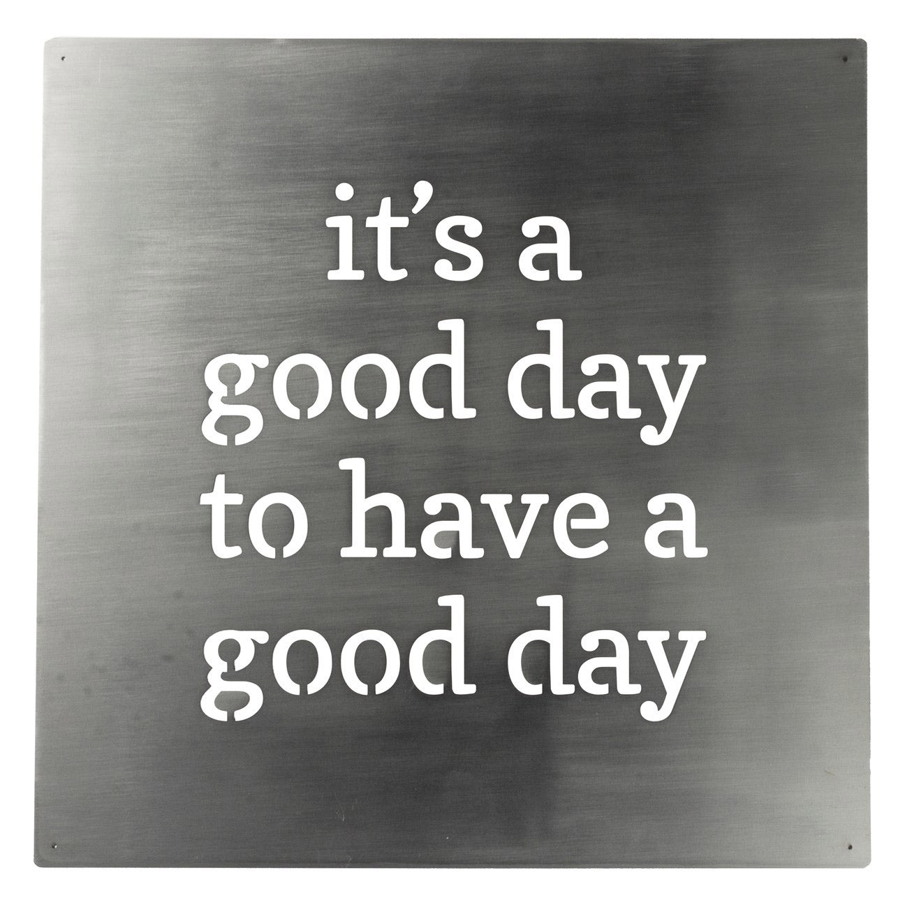 Inspiring “It’s A Good Day To Have A Good Day” precision cut sentiment in a brushed metal plate. When hung via the included nails & spacers and illuminated, a soft shadow will be projected behind metal word art, creating charming ambience.