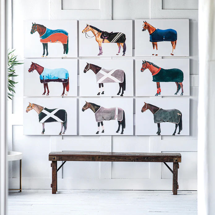 Horse racing is a performance sport that has been practiced since ancient times. Race day is often full of color and pomp. This set of nine On To The Races Canvas Prints is elegant and modern with a focus on the horses and their equine covers. The set would make a statement on any wall it is placed.