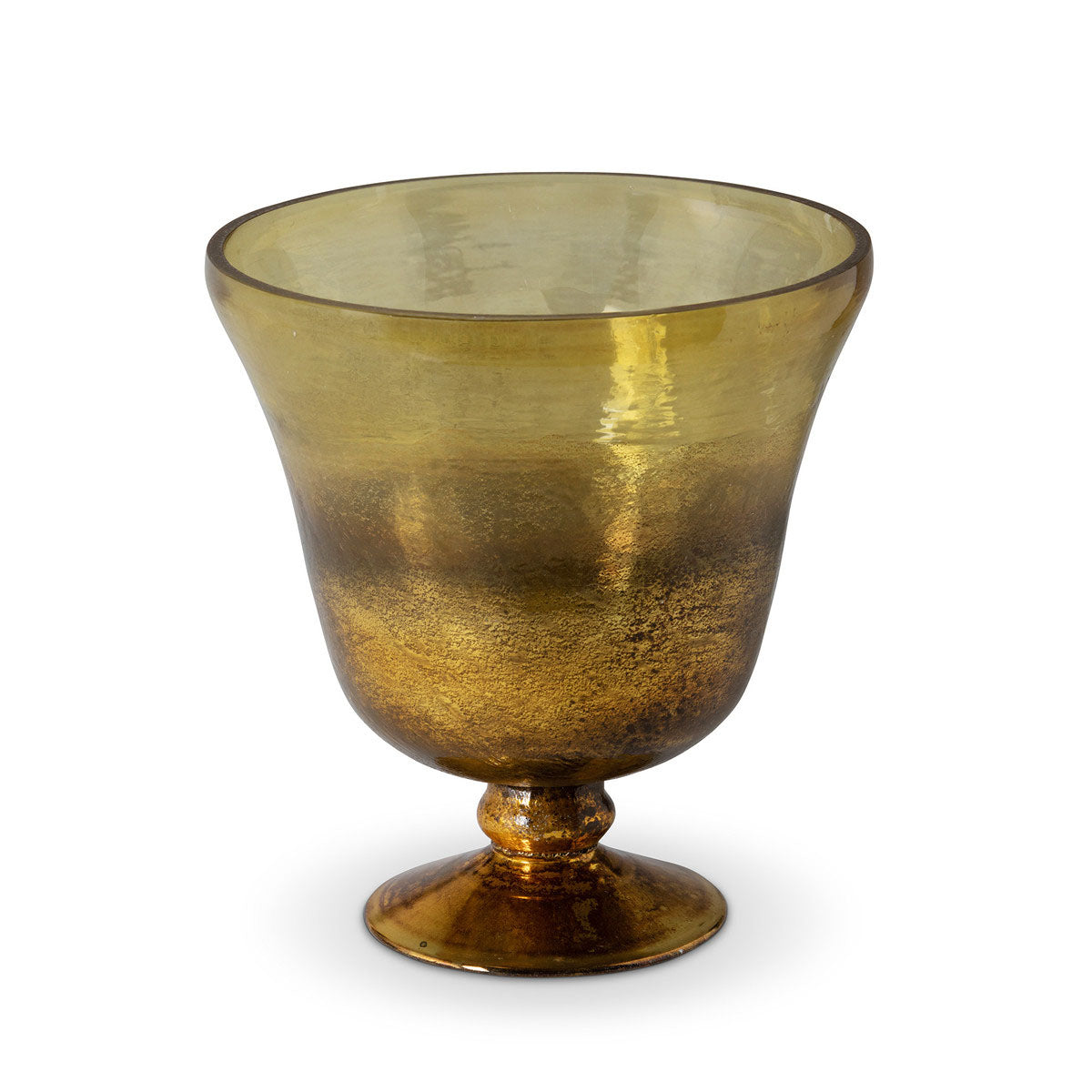 Enhance any space with our Oxidized Footed Urn, a stately vase with a unique, rich tone. The recycled blown glass adds an airiness to the gold piece, creating a baroque style suitable for elegant floral arrangements. A true display of sophistication and exclusivity.