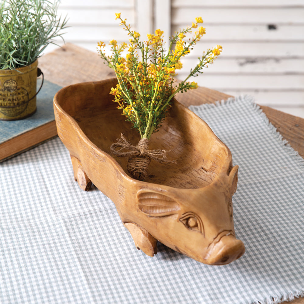 We are in love with this little guy. This whimsical bowl measures 7″ wide 16″ long and 4″ tall. The carved pig has feet and a curled tail. Fill with greenery, or bowl fillers and use for decor or perfect for on the counter filled with fruit or use lined with a towel for bread for guests.