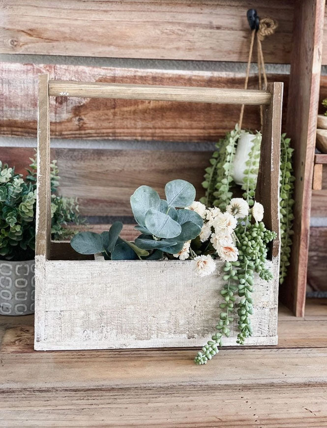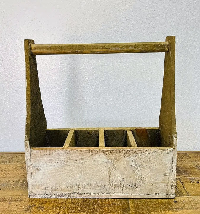 Indulge in the rustic elegance of the Primitive Style Wooden Tool Box. The white weathered finish gives it an old-world charm, perfect for displaying floral arrangements. It also makes for a stylish and practical storage solution for silverware on your kitchen counter or for pens and pencils in your craft room or office.