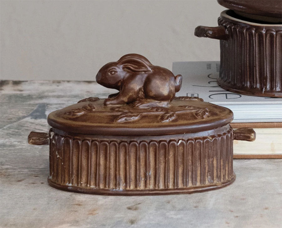 Create and enjoy delicious foods with the Rabbit Topped Stoneware Baker! Perfect for melting brie and other dishes, this adorable baker adds charm to your kitchen counter. Its versatile design allows for both cooking and decorative use. Elevate your cooking experience with this must-have stoneware baker.