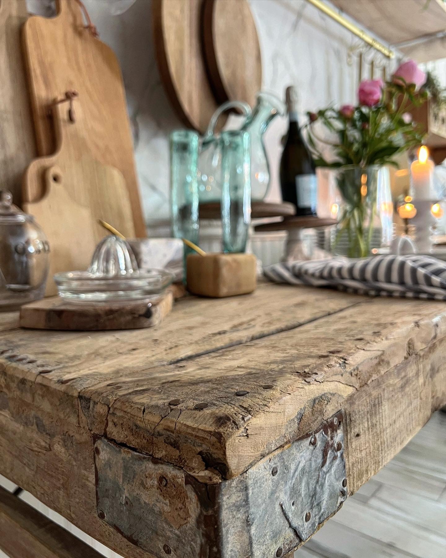 This one of a kind folding table will draw amazement from whoever comes near it. The heavily distressed table is made with pieces of reclaimed wood that was a part of river boats from local river villages. The piece also may have tin patches in areas. Because reclaimed wood pieces are each unique, no table will ever have the same finish.