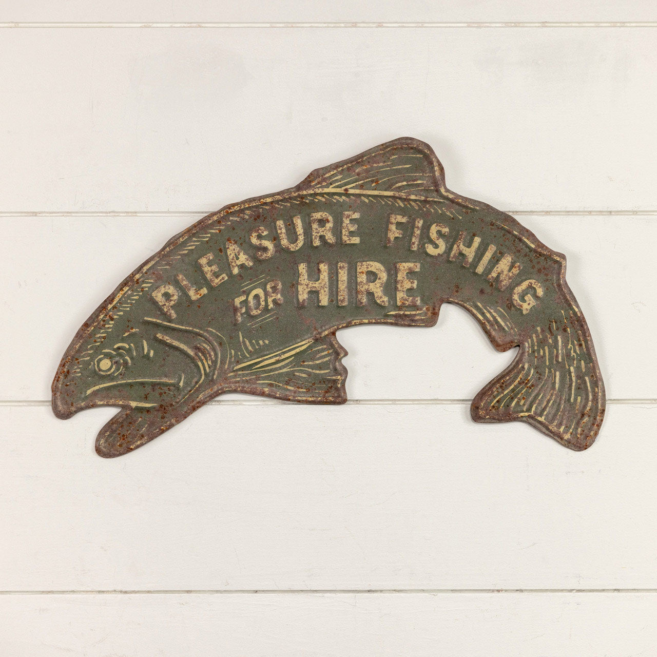Experience the charm of old fishing with our Rustic Style Fishing Sign. Made to look worn and aged, it features a fish-shaped design and green color. Hang it up in your home or cabin for a touch of nostalgia and add a vintage twist to your decor. Perfect for fishing enthusiasts!