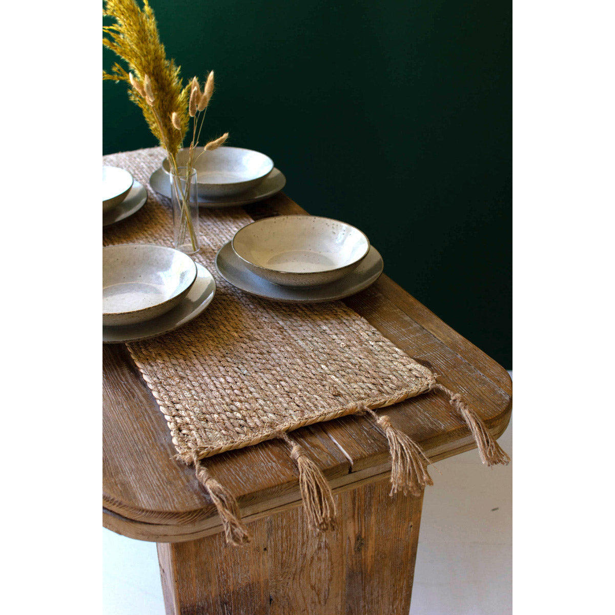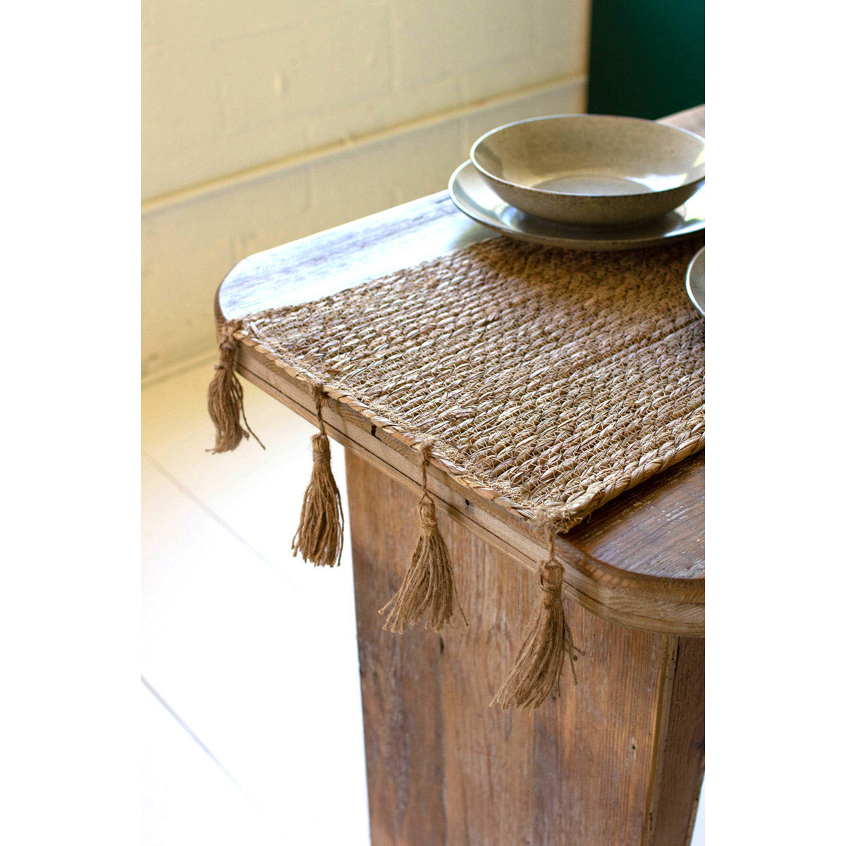 This table runner is perferct for a table, island or server. It would even look pretty on a dresser. Made of seagrass with tassels on the end it would complete the look of your table setting.