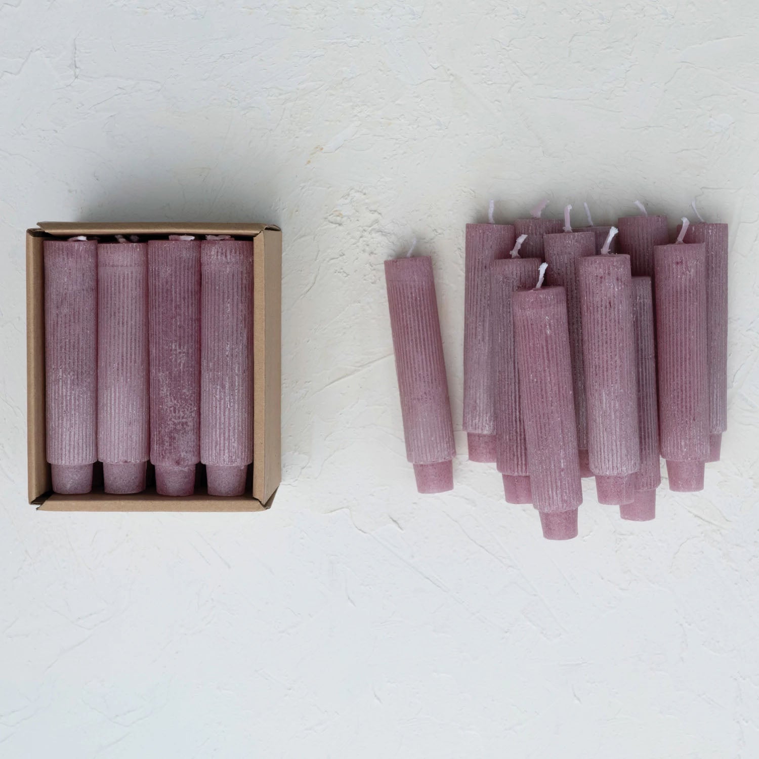 Unscented Pleated Taper Candles In Box, Powder Finish, lavender Color, Set of 12 (Approximate Burn Time 5 Hours)