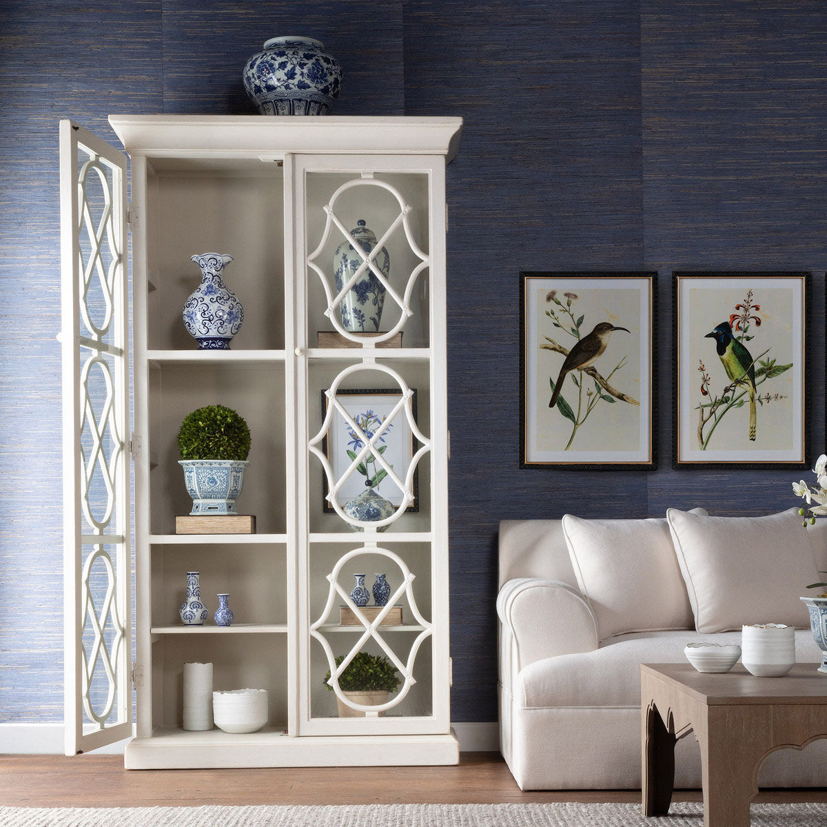 Indulge in timeless elegance with The Adeline Cabinet. Its quatrefoil overlay design on the glass doors adds a classic touch to any room. With abundant storage and removable shelves, this cabinet is versatile enough for any space – from the dining room to the living room or office.