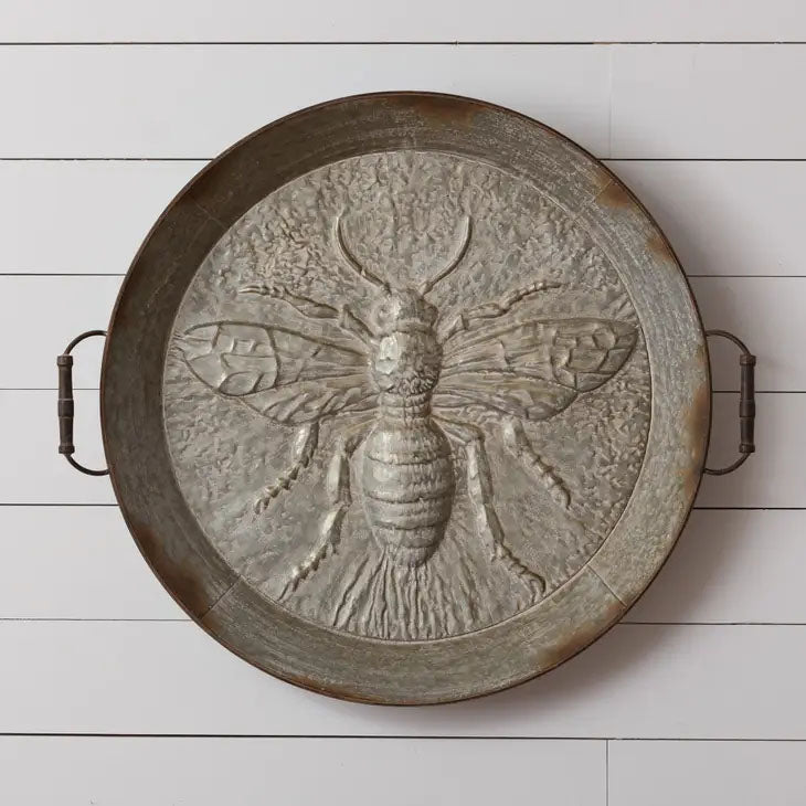 The Bee Tray is a versatile addition to any home decor. Lean on a mantle, or sit on a fabric ottoman to create a charming small table area. Its beautifully made design features an embossed bee and sturdy wooden handles. Elevate your space with this functional and stylish piece! T