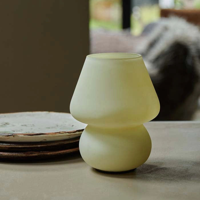 Experience the perfect blend of style and convenience with the Cordless LED Table Lamp in Buttermilk color. Portable and battery operated, this charming lamp with a frosted yellow glass in a whimsical mushroom design emits a warm and inviting glow. No plug socket? No problem! Place it anywhere for a stunning effect.
