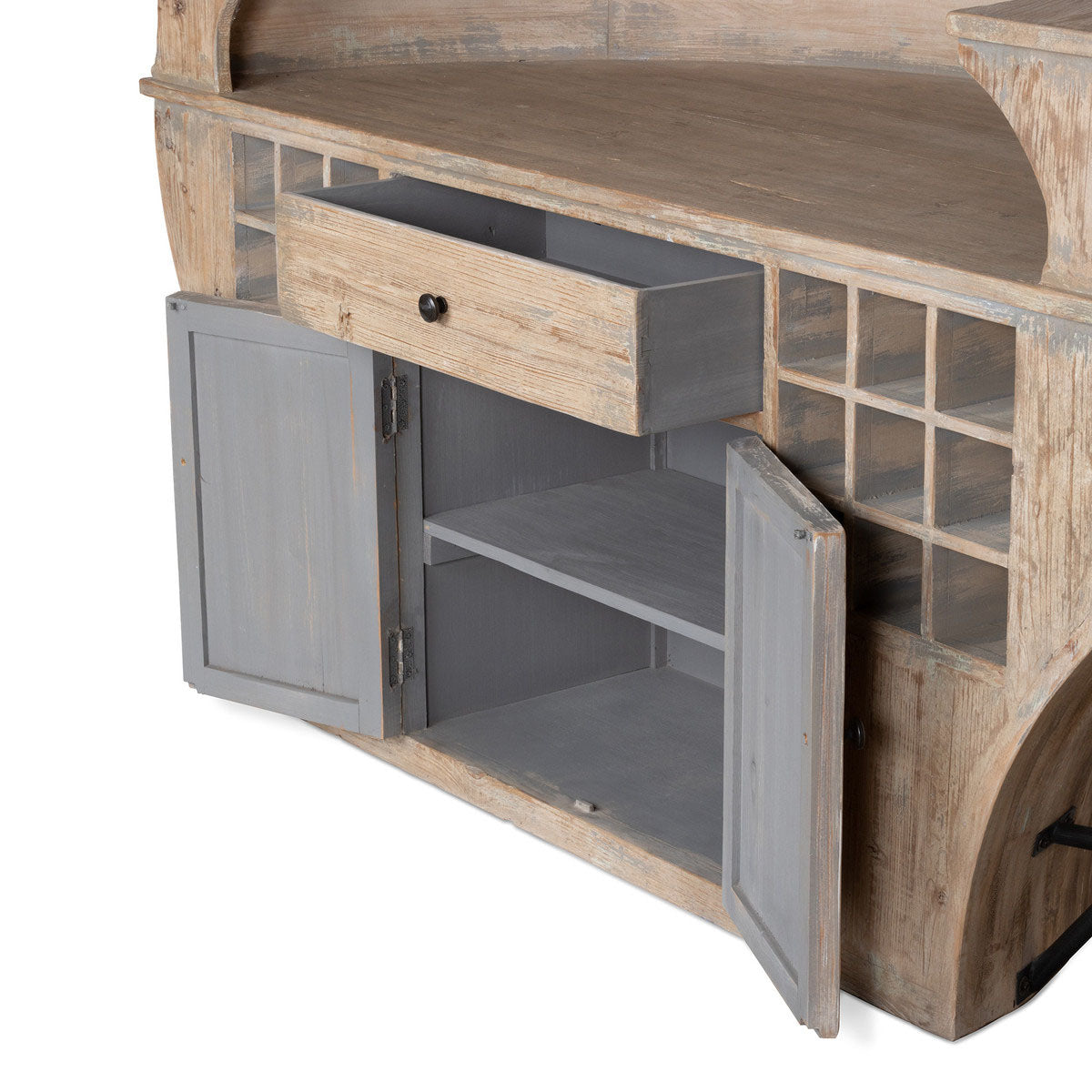 Indulge in the beauty of The Demi-Lune Bar, a masterpiece of craftsmanship. With its semi-burnished facade and unique shape, it exudes sophistication and luxury. The interior boasts a work surface, ample storage for 18 wine bottles, and a drawer and cupboard for all your hosting needs.