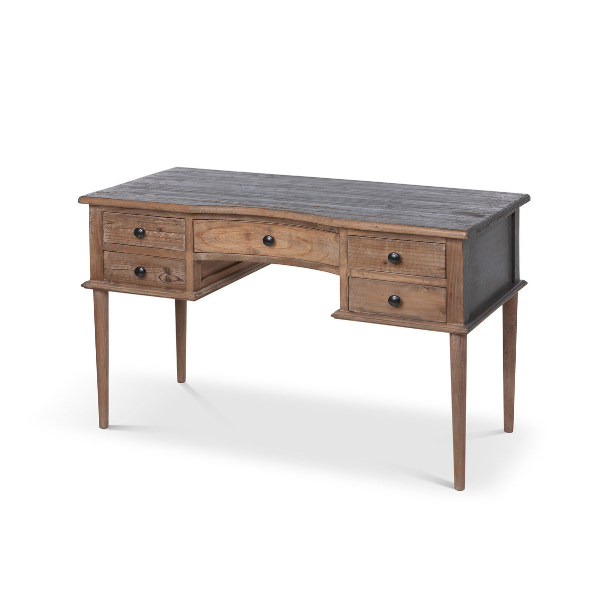A beautiful piece that can be used as a vanity or desk, this pine piece is loaded with charming features. From the curved center to the antiqued black top finish that highlights the iron pulls, the Emma Desk details bring it from ordinary to unique. With 5 drawers for storage, this piece offers ample storage in its compact physique. The back of the piece is finished to perfection, so it can float in a room, giving you boundless design options.