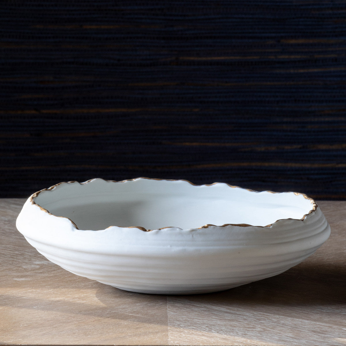 The Gilded Organic collection includes artisan crafted white porcelain vessels with a glistening golden rim. The formal finishes modernize these organic containers that showcase ridges along their exterior from their thrown clay formation and beautifully imperfect edges along the opening, which are celebrated with gilded detail. This expertly formed and hand painted is an exquisite shelf accessory, and the perfect pot for succulents and ornamental grasses or flowers that lean into the container’s modern flair and will allow its gold accent to shine.