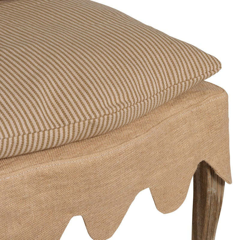 Indulge in elegance with our Julia Chair. This High Tea Dining Chair boasts a charming scalloped slip-covered burlap skirt, striped cushion, and rounded cane back for a touch of sophistication. Elevate your dining experience and add a luxurious touch to your home with this amazing piece.