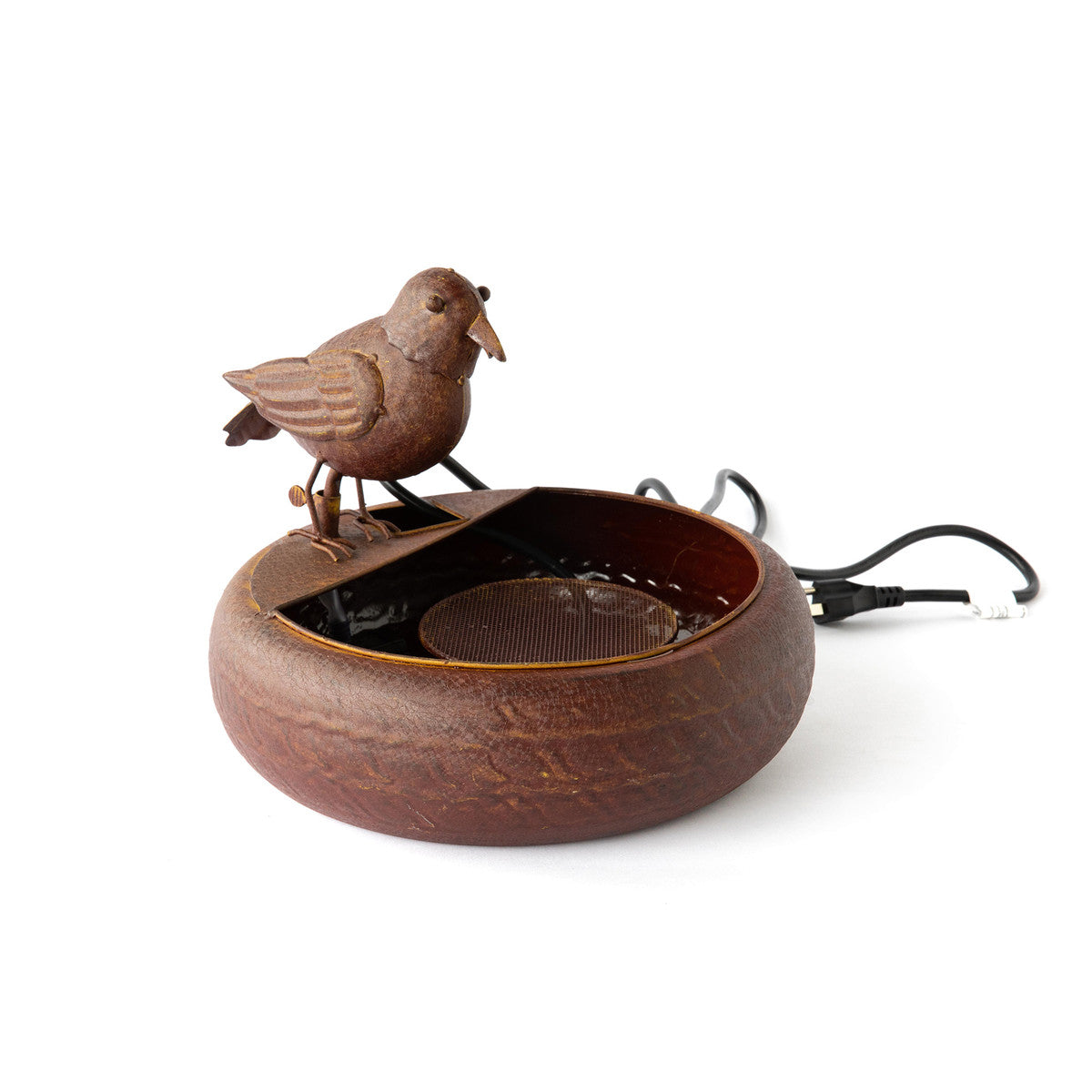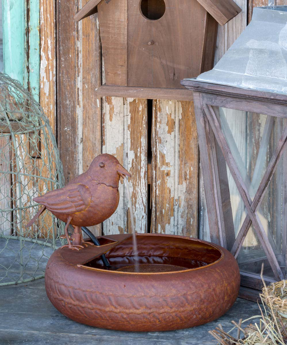 A charming addition to any patio or garden, this folk art inspired little bird fountain features an aged, rusted metal finish. Submersible pump included with adjustable water flow. Splash screen included.
