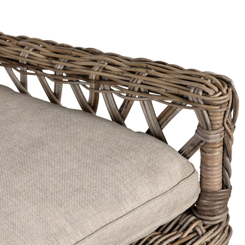 Elevate your space with The Megan Rattan Chair. This luxurious lattice style rattan armchair adds a touch of sophistication to any room, whether indoors or in a covered outdoor area. Its neutral colors and timeless design make it the perfect addition to a classic or contemporary setting.