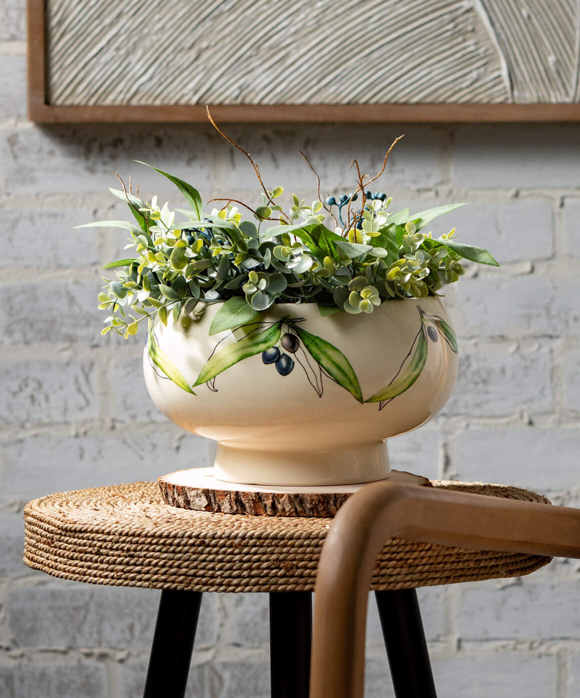 Elevate your home decor with The Olive Pedestal Bowl. This elegant ceramic bowl features a stylish pedestal design and a creamy white color that adds a touch of sophistication to any room. Perfect for adding both design and functionality to your home.