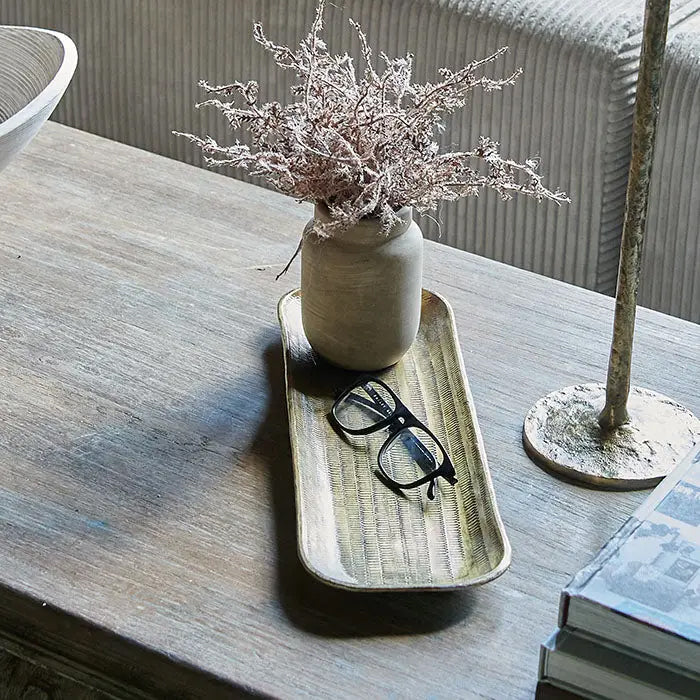 Style up your coffee tables and consoles with the beautiful long Orla tray. In a soft antique gold with texture reminiscent of a basket weave, this decorative tray will catch the eye and add tons of personality in the process. It makes the most stylish place to cluster a few candles or store every day accessories like keys and remotes. Available in three sizes, together they will make the ultimate decorative trio!