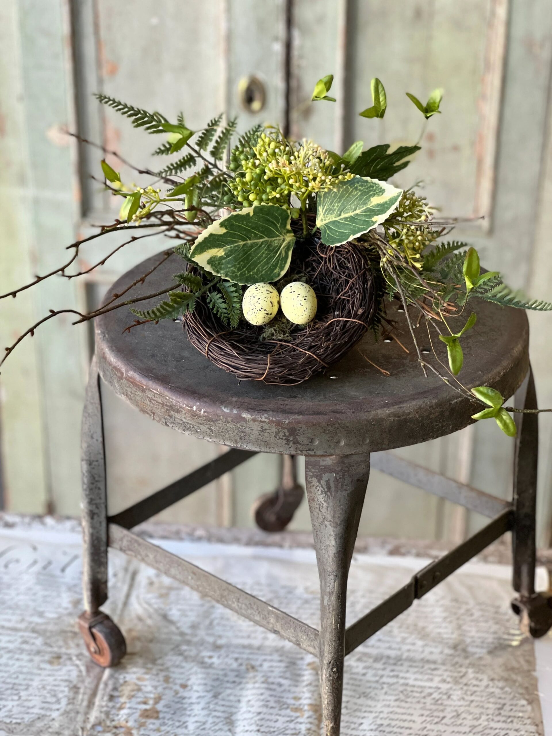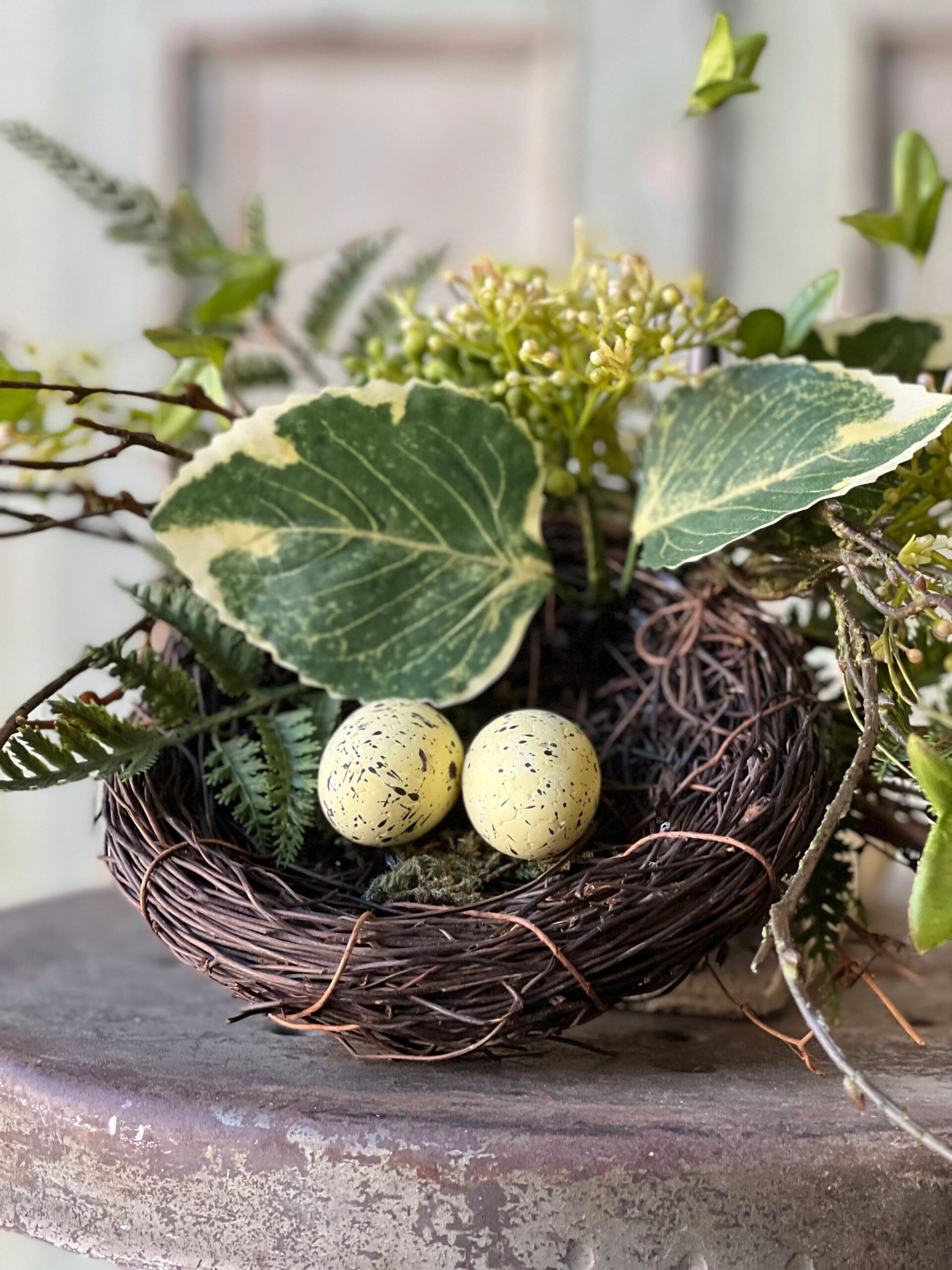 Create a natural and inviting atmosphere with our Unfurled Fronds Nest. This mix of variegated leaves, ferns, and other charming accents, including delicate seed heads and nested eggs, adds an organic touch to any space. Perfect for your table or under a cloche, it’s a must-have for any nature lover.