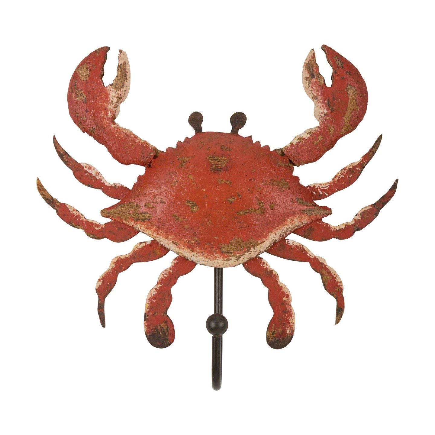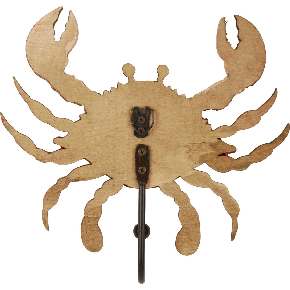 A wooden decorative Crab Wall Hook featuring a metal hook for hanging accessories on a wall. Design features red and black paint with distressed details. Our crab hook is easy to hang via included metal hanger attached on the back. A rustic everyday home accent with a nautical theme.