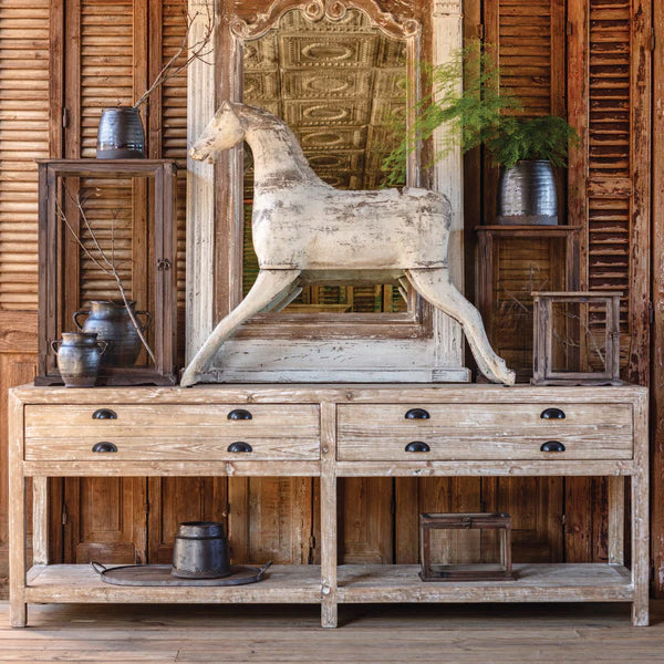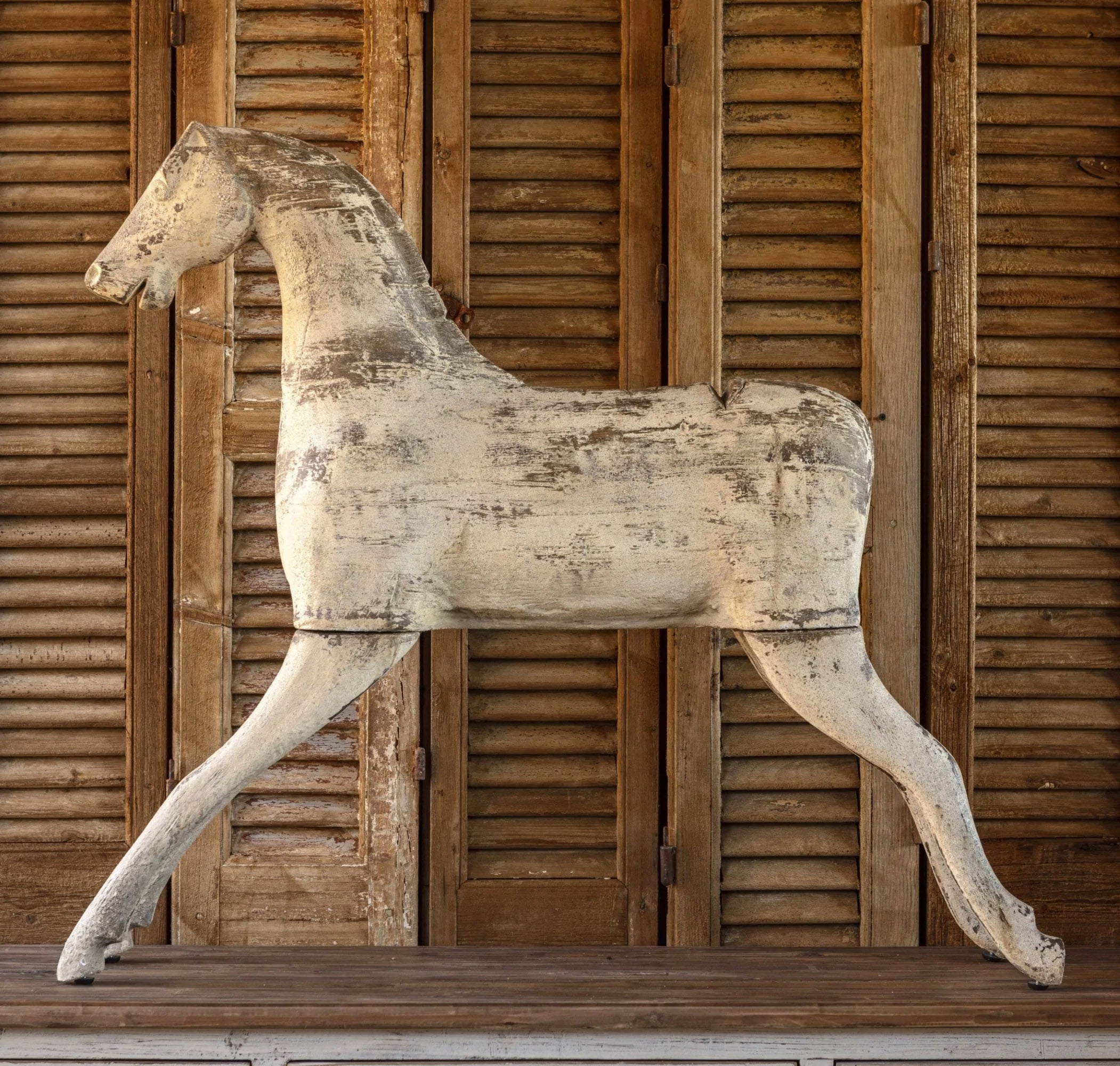 This weathered hobby horse, is modeled after a rare collected antique to exacting stature and detail. Our horse relic does not come with a tail as antique horses often had horsehair tails that had long ago disappeared. It is made to look as if it has been sitting in the attic for many many years. The legs are easily attached after unpacking to prevent damage while shipping. We hope you love our weathered hobby horse as much as we do!