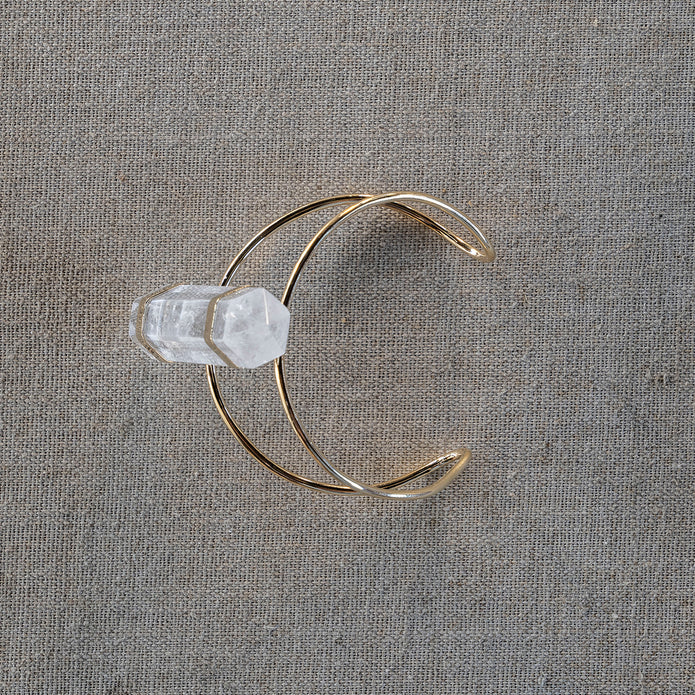 At the center of the gold-plated Wire Cuff Bracelet sits a single white crystal that is 2.5 inches in height. This striking arm band easily adjusts to the desired fit. The piece is simply stunning.